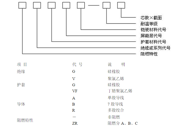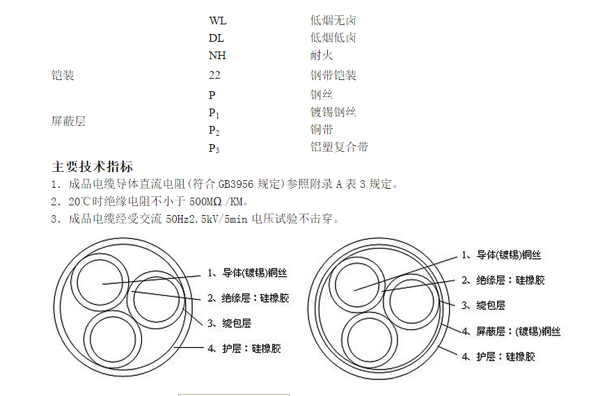 硅橡膠電纜的工藝參數及特點 控制電纜 特點及用途 本產品適用于交流額定電壓450/750V及以下移動或固定裝置敷設,作電器儀表連接或信號傳輸線,產品采用硅橡膠J緣、硅橡膠或聚氯乙烯護套工藝,具有較好的熱穩定性,能在高溫、高寒環境下保持良好的電器性能和柔軟性,適合冶金、電力、石化等行業使用。 執行標準 Q/CF005 阻燃耐火特性試驗執行GB12666-90標準。 使用特性 1. 高工作溫度:180℃。低環境溫度:硅橡膠護套,固定敷設-60℃;非固定敷設-20℃。 2. 電纜安裝敷設溫度:應不低于-20℃。 3. 電纜允許彎曲半徑:非鎧裝電纜小為電纜外徑的6倍。 型 號 M 稱 YGZ 硅橡膠J緣及護套移動用控制電纜 YGZP 硅橡膠J緣銅絲屏蔽硅橡膠護套移動用控制電纜 KGG 硅橡膠J緣及護套控制電纜 KGGP 硅橡膠J緣銅絲屏蔽硅橡膠護套控制電纜 KGV 硅橡膠J緣聚氯乙烯護套控制電纜 KGV22 硅橡膠J緣鋼帶鎧裝聚氯乙烯護套阻燃控制電纜 ZR-KGV 硅橡膠J緣聚氯乙烯護套阻燃控制電纜 注:本表中未列出的電纜型號可按照型號說明的規定組成。